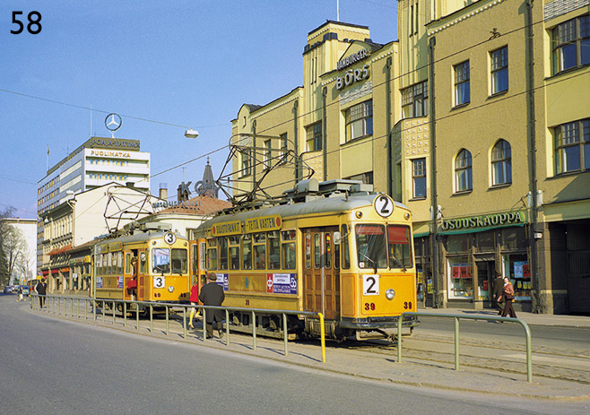 Turku: Karian ja Strömbergin kaksiakseliset vaunut 39 ja 40 vuodelta 1951 linjoilla 2 ja 3 Kauppatorilla, kuvattu 4/72.