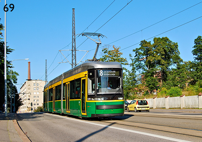 Helsinki: Transtechin matalalattiainen nivelraitiovaunu 402 vuodelta 2013 Hämeentiellä Arabiassa linjalla 8. Kuvattu 9/15.
