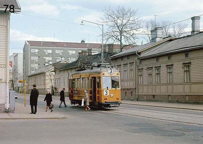 Turku: Karian ja Strömbergin kaksiakselinen vaunu 45 vuodelta 1951 linjalla 3 Itäisellä Pitkäkadulla, kuvattu keväällä 1969. Kuva Juhana Nordlundin kokoelmasta.