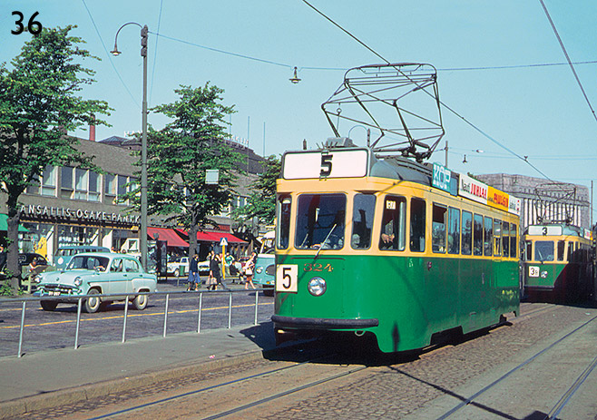 Helsingfors: Ratt-Karia nr 324 från år 1955 på linje 5 i originalskick med takreklamer och linjebeteckningslåda av glas. Fotograferad 6/62. Copyright Philip Tatt Collection.