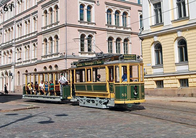 Helsingfors: Lillsvensken 50 från år 1909 och öppna släpvagnen 233 från år 1919 på Senatstorget med gröna linjens skyltar, fotograferad 7/13.
