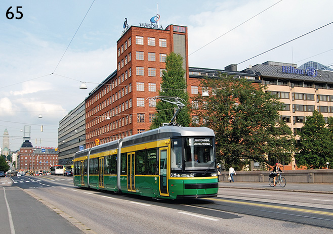 Helsingfors: Transtechs låggolvsledspårvagn från år 2013 fotograferad på Långa bron på linje 9. Fotograferad 9/13.